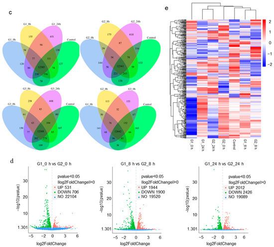 The differentially expressed genes (DEGs) were analyzed and the total, upregulated, and downregulated DEGs per group were enumerated (Table S1). A volcano map shows the overall distribution of the DEGs in both sample groups (Figure 3d). After software analysis, screening was performed with the criteria of log2 (FoldChange) > 0 and p-value < 0.05, and a total of 1237 differentially expressed genes with significant relationships were obtained, including 531 upregulated genes and 706 downregulated genes, as shown in Figure 3d (left). When the cells were harvested after digesting with animal-based enzymes or animal-origin-free enzymes at 37 °C for 8 h, there were differences in the expression levels of 3844 genes, of which 1944 were upregulated and 1900 were downregulated, as shown in Figure 3d (middle). When the cells were harvested after digesting with animal-based enzymes or animal-origin-free enzymes at 37 °C for 24 h, the differences in the expression levels of 4438 genes were detected, including 2012 upregulated genes and 2426 downregulated genes, as shown in Figure 3d (right). The results show that there were significant differences in the effects of animal-based enzymes and animal-origin-free enzymes on the physiological state of cells.