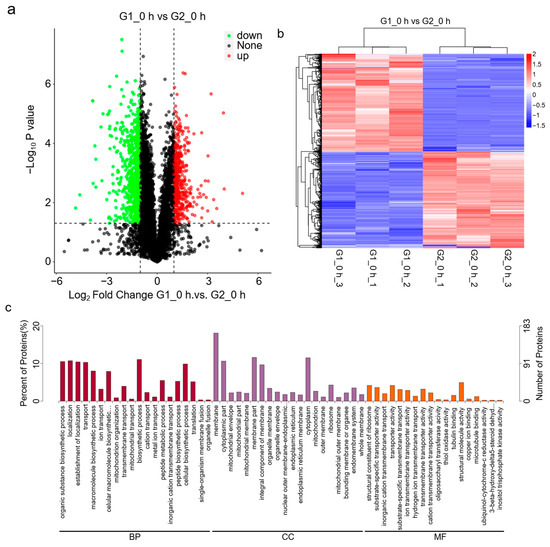 In order to explore the effects of animal-based enzymes and animal-origin-free enzymes on the protein levels of Vero cells, we treated cells with animal-based enzymes, animal-origin-free enzymes, and nonenzymatic digests at 37 °C, as shown in Figure 1. Proteomic detection was performed using the procedure shown. There were 1507 differentially expressed proteins caused by the detachment of Vero cells with animal-based enzymes and animal-origin-free enzymes, and the differential proteins were drawn as a volcano map as shown in Figure 4a, and as a differential protein heat map as shown in Figure 4b.