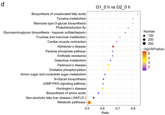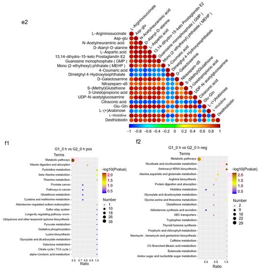 Volcanic map results show that 210 positive-ion-mode metabolites were significantly different in the G1_0h vs. G2_0h comparison group, among which 196 metabolites were upregulated and 14 metabolites were downregulated (Figure 5d1). There were 105 negative-ion-mode metabolites that were significantly different, with 87 metabolites upregulated and 18 metabolites downregulated (Figure 5d2). See Figure 5e1,e2 for correlations of metabolites with significant differences between positive/negative ion mode animal-based enzyme and animal-origin-free enzyme groups. In order to explore the physiological functions of metabolites affected by animal-based enzymes and animal-origin-free enzymes, KEGG pathway enrichment analysis was performed on the differential metabolites of animal-based enzymes and animal-origin-free enzymes. Through KEGG pathway enrichment analysis, the major biochemical metabolic pathways and signal transduction pathways involved in differential metabolites could be determined. The most significant 20 pathways were selected to draw bubble charts, as shown in Figure 5f1 (positive ion mode) and Figure 5f2 (negative ion mode).