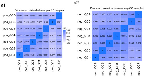 In order to further explore the effects of animal-based enzymes and animal-origin-free enzymes on the metabolic level of Vero cells, cells treated with animal-based enzymes, animal-origin-free enzymes or enzyme-free digestive solution at 37 °C were subjected to metabolomics detection according to the process shown in Figure 2. The results show that the Pearson correlation coefficient between QC samples was calculated based on the relative quantitative values of metabolites [36]. In positive ion mode, the correlation of QC samples is shown in Figure 5a1; in negative ion mode, the correlation of QC samples is shown in Figure 5a2. PCA analysis was performed on the extracted peaks of all experimental samples and QC samples, as shown in Figure 5b1,b2. The above results show that the better the stability of the whole detection process, the higher the data quality.