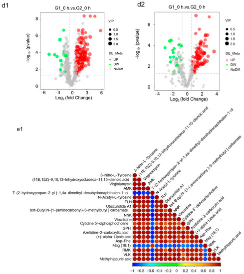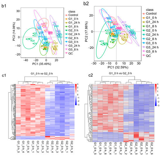 The results of untargeted metabolomics technology show that a total of 615 positive-ion-mode metabolites and 351 negative-ion-mode metabolites were identified in 60 samples, including the control. Differential metabolites were screened according to the criteria of VIP > 1.0, FC > 1.5 or FC < 0.667, and p-value < 0.05. Based on the above data, hierarchical clustering analysis was performed on the differential metabolites obtained in each group to determine the differences in metabolic expression patterns between and within the two groups in the same comparison pair, as shown in Figure 5c1 (positive ion mode) and Figure 5c2 (negative ion mode).