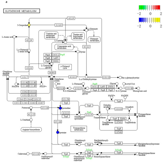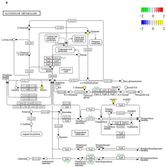 We found that the 37 °C animal-based enzymes 0 h group (G1_0h) versus the 37 °C animal-origin-free enzymes 0 h group (G1_0h) was involved in glutathione metabolism in Vero cells (Figure 6a,b). In positive ion mode, the cellular metabolite 5-hydroxyproline was significantly upregulated, and the metabolites spermine and spermidine were significantly downregulated (Figure 6a). In negative ion mode, the cellular metabolites nicotinamide adenine dinucleotide phosphate and L-glutamate were significantly upregulated (Figure 6b). The differentially downregulated genes were PepN, TryS, TcTryS, and TcTryR. In conclusion, the results of combined metabolome and transcriptome analysis further confirm that animal-based enzymes may affect the metabolism of glutathione by downregulating the levels of spermine and spermidine metabolites, and thus affect the normal physiological state of Vero cells.