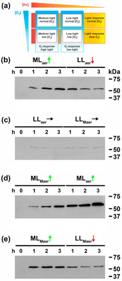 - Ritter, S.P.A.; Brand, L.A.; Owttrim, G.W. Redox poise of the electron transport chain is sensed through QB and transmitted by Hik8-RpaA-RpaB signaling to regulate CrhR RNA helicase accumulation in Synechocystis PCC 6803. Cells, 2022; submitted. [Google Scholar]