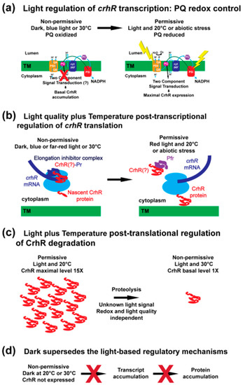 Summary: Discrete light signals regulate crhR expression. (a–c) Three discrete light signals regulate crhR expression at distinct points. (a) Light driven redox regulation. Under non-permissive conditions when CrhR is not required (dark, blue light, or 30 °C) the relatively oxidized PQ pool does not activate a two-component signal transduction chain leading to enhanced crhR transcript accumulation. This unknown signal transduction pathway is activated by permissive conditions (light and 20 °C or abiotic stress) yielding crhR expression. (b) Light quality regulation of CrhR accumulation. For conditions under which CrhR is not required and/or expressed (dark, blue light or 30 °C) we propose that translation has initiated on crhR transcripts however elongation has halted, potentially involving binding of Pr or an unknown factor, potentially CrhR (Crh?). Transfer to permissive conditions where CrhR is expressed or required (red light and 20 °C) relives the translational block allowing translation elongation and full-length CrhR production. In response to dark-light transfer, conversion of Pr-CrhR to Pfr-CrhR or binding of activated Pfr to CrhR could remove the translational block. (c) Light-dependent proteolysis. A redox- and light quality-independent light signal is required for induction of CrhR proteolysis in response to temperature upshift from 20 °C to the non-permissive condition, 30 °C. (d) Dark supersedes the light-based regulatory mechanisms. crhR transcript and protein are not observed to accumulate at 20 or 30 °C. This indicates that darkness counteracts the low-temperature and light induction signals, reinforcing the requirement for light signals for expression.