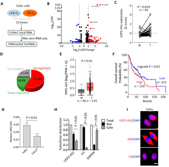Figure 1. Hypoxia-regulated lncRNA USP2-AS1 is highly expressed in HNSCC. (A) Flow chart of RNA-seq for hypoxia and normoxia treatments. (B) Volcano plot analysis of the RNA-seq data: red and blue plots indicate hypoxia up- and downregulated lncRNAs (fold change ≥ 1.5, FDR ≤ 0.05), respectively. (C) USP2-AS1 in TCGA-HNSCC normal and tumor paired samples: N, normal; T, tumor. (D) Pie chart depicting the change in USP2-AS1 in paired HNSCC patients. (E) USP2-AS1 in TCGA-HNSCC and GTEx normal and TCGA-HNSCC tumor samples: N, normal; T, tumor. (F) Highly expressed USP2-AS1 predicts poorer prognosis in HNSCC patients, data from TCGA-HNSCC dataset. (G) qRT-PCR analysis of USP2-AS1 in indicated HNSCC cell lines. (H) qRT-PCR analysis of the subcellular distribution of USP2-AS1 in FaDu cells: U1 as nuclear marker, GAPDH as cytoplasm marker. (I) FISH assay analysis of the subcellular distribution of USP2-AS1 in FaDu cells: U6 as nuclear marker, 18S RNA as cytoplasm marker. Scale bar, 20 μm; data in (C,G,H) are presented as the mean ± SD of three independent experiments, with p value indicated.
