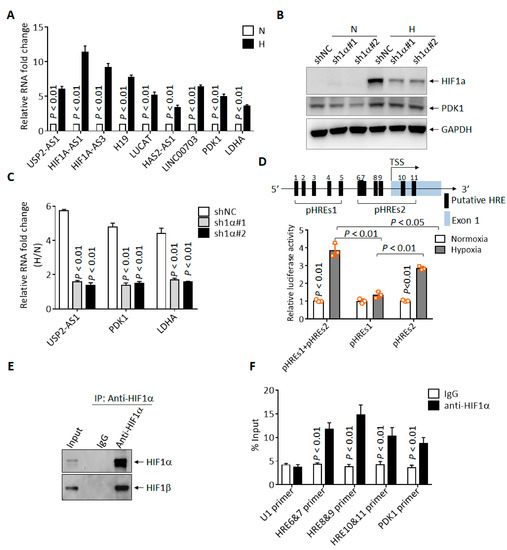 Figure 2. USP2-AS1 is a direct target of HIF1α. (A) qRT-PCR analysis of indicated lncRNAs in FaDu cells under normoxia and hypoxia. (B) Immunoblotting analysis of HIF1α in FaDu cells with or without HIF1α knockdown: PDK1 as HIF1α-target control. (C) qRT-PCR analysis the level of USP2-AS1 in FaDu cells with or without HIF1α knockdown: PDK1 and LDHA as HIF1α-target controls. (D) Schematic diagram of USP2-AS1 promoter with hypoxia-responsive elements (HREs) indicated (top): dual-luciferase reporter assays revealed that both pHREs1+2 and pHREs2 USP2-AS1 promoter constructs but not pHRESs1 were responsive to hypoxia (bottom) in HEK293T cells. (E,F) ChIP-WB analysis revealed that HIF1α antibodies could immunoprecipitate HIF1β (E), and ChIP-qPCR analysis revealed that HIF1α bound to indicated USP2-AS1 HRE regions (F): U1 as negative control, PDK1 as positive control. Data in (A,C,D,F) represent the mean ± SD of three independent experiments, with p value indicated.