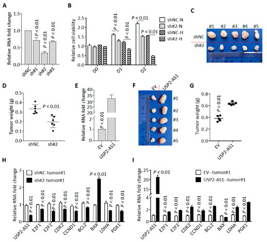 Figure 3. Knockdown of USP2-AS1 inhibits cell proliferation both in vitro and in vivo. (A) qRT-PCR analysis of the level of USP2-AS1 in shRNA-transfected FaDu cells: NC, negative control. (B) Knockdown of USP2-AS1 dramatically inhibited FaDu cell proliferation under both normoxia (N) and hypoxia (H), as measured by CCK8 cell viability assays. (C,D) Knockdown of USP2-AS1 inhibited subcutaneous tumor formation by FaDu cells: tumor size (C) and weight (D) are shown. (E) qRT-PCR analysis of the level of USP2-AS1 in CAL27 cells with or without USP2-AS1 overexpression: EV, empty vector. (F,G) Overexpression of USP2-AS1 promoted subcutaneous tumor formation by CAL27 cells: tumor size (F) and weight (G) are shown. (H,I) qRT-PCR analysis of the cell-cycle-, apoptosis-, and glycosis-related genes in indicated FaDu (H) and CAL27 (I) xenograft tumors. Data in (A,B,E,H,I) represent the mean ± SD of three independent experiments, with p value indicated.