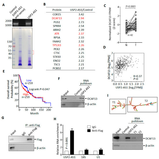 Figure 4. USP2-AS1 binds to DCAF13 in HNSCC cells. (A) In vitro transcribed biotin-labeled USP2-AS1 and control (top) were used for RNA-pulldown assays: Coomassie brilliant blue staining of pulled-down samples are shown (bottom). (B) LC–MS/MS-identified USP2-AS1-bound proteins are listed. (C) DCAF13 in TCGA-HNSCC normal and tumor paired samples: N, normal; T, tumor. (D) DCAF13 is positively correlated with USP2-AS1 in HNSCC patients, data from TCGA. (E) Kaplan–Meier plot revealed that the high expression of DCAF13 predicts poor prognosis in HNSCC patients, data from TCGA-HNSCC dataset. (F) RNA-pulldown revealed that USP2-AS1 binds to DCAF13, but not β-actin. (G,H) RNA-IP-WB revealed that Flag antibodies immunoprecipitated Flag-DCAF13 (G), and RNA-IP-qPCR indicated that Flag-DCAF13 bound to USP2-AS1, but not 18S RNA and U1 snRNA (H). (H) The secondary structure of USP2-AS1 was predicted using the RNAfold website: rectangles indicate the truncated constructs T1 and T2 (top). RNA-pulldown assays revealed that T1 and T2 lost some (T1) or all (T2) of their ability to bind to DCAF13. Data in (C,G,H,I) represent the mean ± SD of triplicate experiments.