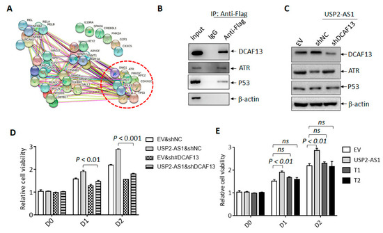 Figure 5. USP2-AS1 through DCAF13 promotes HNSCC progression. (A) String analysis of the putative substrates of DCAF13 predicted by UbiBrowser 2.0. (B) Flag-co-IP-WB revealed that indicated proteins bound to DCAF13 in FaDu cells under hypoxia for 12 h. (C) Immunoblotting analysis of indicated proteins in CAL27 cells with indicated transfection. (D,E) CCK8 assays analyzed the cell viability of CAL27 cells with USP2-AS1 (D), T1, and T2 overexpression under normoxia (E). Data in (D,E) are presented as mean ± SD of triplicate experiments. The experiments in (B,C) were conducted in triplicate.