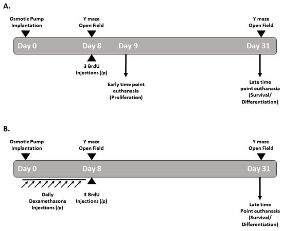 - Kim, J.B.; Ju, J.Y.; Kim, J.H.; Kim, T.Y.; Yang, B.H.; Lee, Y.S.; Son, H. Dexamethasone inhibits proliferation of adult hippocampal neurogenesis in vivo and in vitro. Brain Res. 2004, 1027, 1–10. [Google Scholar] [CrossRef]