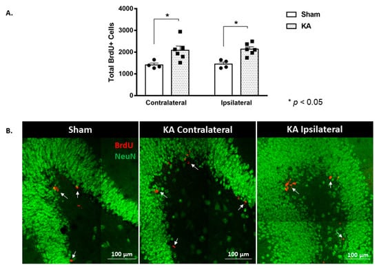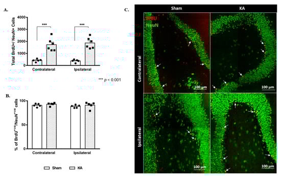 The total number of labeled cells elicited an almost 3-fold increase in BrdU-positive cells in both the contralateral DG (1730 ± 214 versus 424 ± 51 in the sham group; p < 0.001) and the ipsilateral DG (1869 ± 184 versus 378 ± 54 in the sham group) (F (1,18) = 76.61, p < 0.001; Sidak’s multiple comparison test, p < 0.001) (Figure 4A,C). However, the % of double-positive BrdU/NeuN cells out of the total BrdU-positive cells was similar between the sham and KA micro-perfused groups, and there were no differences within the same group between the contralateral (90.71% ± 1.48 and 92.9% ± 1.38 in the sham and KA micro-perfused groups, respectively) and the ipsilateral DG (88.42% ± 1.36 and 90.69% ± 2.99 in the sham and KA micro-perfused groups, respectively) (Figure 4B).
