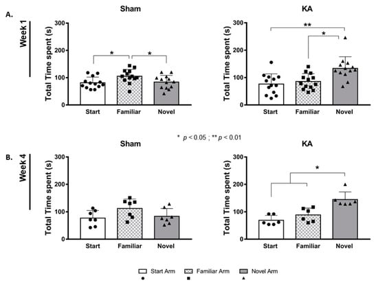 Exploratory behavior of the rats at week 4 was almost comparable to their performance at week 1 (Figure 6B). The sham rats equally explored the three different arms (one-way repeated measures ANOVA, F (1.15, 6.898) = 2.368, p = 0.1688). The KA micro-perfused rats retained the same behavioral exploration performance, with more time spent in the novel arm (138.6 ± 11.2 s) compared to the familiar arm (79 ± 12.9 s, p = 0.0248) or the start arm (76.6 ± 9.8 s, p = 0.0373) (one-way repeated measures ANOVA, F(1.813, 10.88) = 6.833, p = 0.0134; Tukey’s multiple comparison’s test).