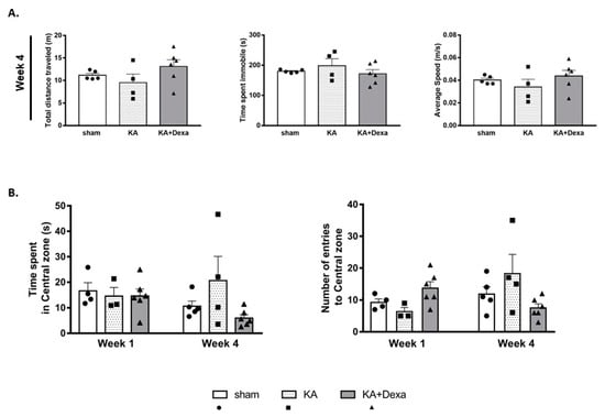 Central zone exploration and mobility in the open field were not affected by KA micro-infusion. (A) Graphs representing mobility measures: the total distance traveled by the sham (n = 5), KA (n = 4), and KA + Dexa (n = 6) rats, the total time spent immobile, and the average speed, and (B) exploration measures: number of entries to the central zone and total time spent in the central zone at week 1 and week 4 for the sham (n = 4 and n = 5, respectively), KA (n = 3 and n = 4, respectively) and KA + Dexa (n = 6 at both week 1 and week 4) rats.