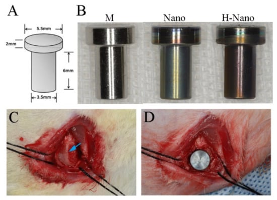 (A) The design and specifications of the implant. (B) Experimental implants of three groups: machined polished implant (M), anode oxidized implant with nanotubes (Nano), and hydrogenated implant (H-Nano). (C) Implantation site. Blue arrow: the distal metaphysis of the femoral condyle. (D) Implant placement.