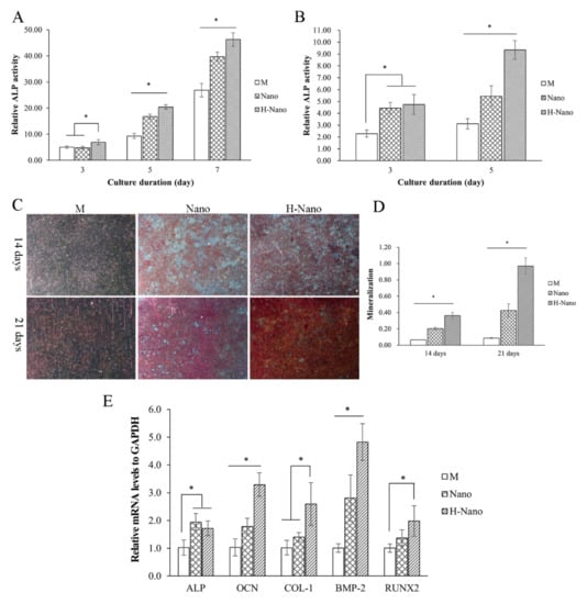 (A) Relative alkaline phosphatase (ALP) activity of BMSCs on the M, Nano, and H-Nano surfaces cultured in the osteogenic medium for 3, 5, and 7 days. (B) Relative ALP activity of BMSCs on the M, Nano, and H-Nano surfaces without osteogenic factors. (C) Alizarin red S staining for calcium nodules after incubation on the specimens for 14 and 21 days. (D) Quantitative analysis of extracellular matrix mineralization on the M, Nano, and H-Nano surfaces at 14 and 21 days. (E) Relative expression levels of osteogenesis-related genes of BMSCs cultured on specimens for 14 days. Expression of ALP, osteocalcin (OCN), type I collagen (COL-1), bone morphogenetic protein 2 (BMP-2), and runt-related transcription factor 2 (RUNX2) is presented according to the relative amount of mRNA with the formula 2(−∆∆Ct). * p < 0.05.