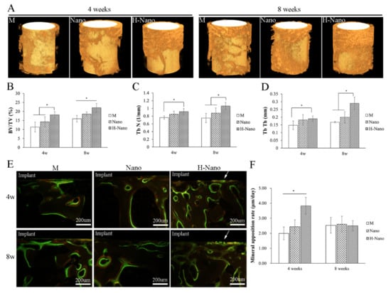 (A) Rendered 3D microcomputed tomography images of bone tissue around the M, Nano, and H-Nano implants after 4 and 8 weeks of healing. (B) Bone volume/total volume fraction (BV/TV, %), (C) trabecular bone number (Tb N), and (D) trabecular bone thickness (Tb Th) of three groups obtained from quantitative analysis of the Micro-CT data. (E) Double-labeled fluorescent images of the M, Nano, and H-Nano group at 4 and 8 weeks. The fluorescent yellow and green strips represent new bone apposition areas labeled by tetracycline and calcein, respectively. White arrows: contact osteogenesis occurred on the implant surface. (F) Quantification of the bone mineral apposition rate in the fluorescence labeled samples. * p < 0.05.