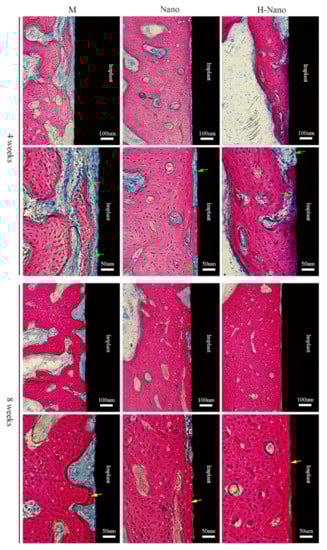 Histological observation of the M, Nano, and H-Nano group after 4 and 8 weeks. Each set of images for all groups were illustrated from three different magnifications of the same region. Methylene blue and acid fuchsin staining. Green arrows: osteoblasts (dark blue). Yellow arrows: new bone formation (dark red).