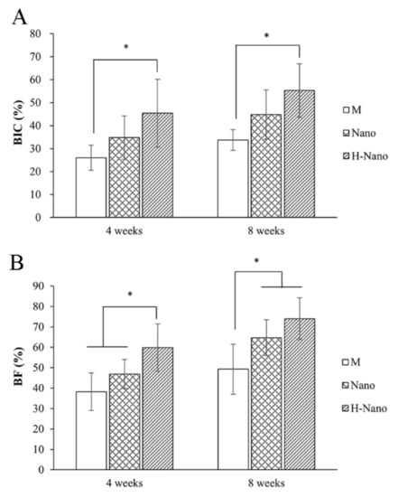 After 4 and 8 weeks of healing, the BIC% and BF% values in the H-Nano group were significantly higher than those in the M group (p < 0.05; Figure 6A,B). In addition, significant differences in BF% values were observed between the M and Nano groups at 8 weeks (p < 0.05).