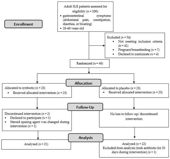Of the 100 patients screened, 46 patients fulfilled the inclusion criteria (Figure 1). Of the 46 female patients with SLE recruited in this study, 23 were randomly assigned to the synbiotic group and 23 to the control group. Recruitment ended after the required sample size was met. The patients’ baseline characteristics are summarized in Table 1. No significant differences were observed between groups concerning age, SLEDAI-2K score, physician general assessment score, the proportion of lupus nephritis, steroid dose, other medications (steroid-sparing agents, vitamin D, proton pump inhibitors, and statins), dietary composition, body mass index, and hs-CRP.