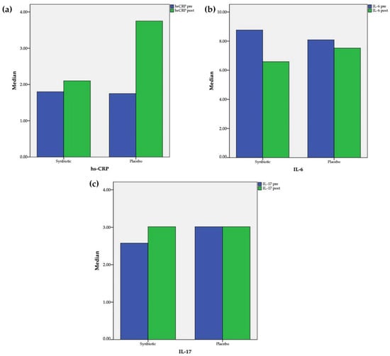 Changes after intervention in the synbiotic and placebo groups: (a) hs-CR; (b) IL-6; (c) IL-17.