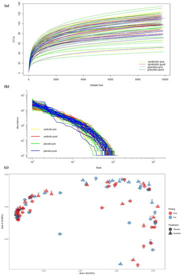 (a) Rarefaction curves from the synbiotic treatment group and the placebo group; (b) Rank abundance curve of the 16s rRNA gene; (c) Principal coordinate analysis (PCoA) comparing the four groups.