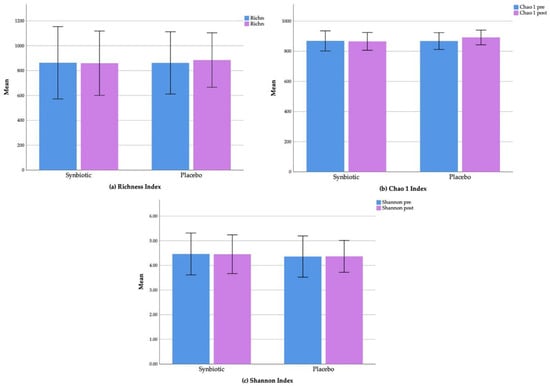 Changes of alpha diversity parameters: (a) Richness index; (b) Chao 1 index; and (c) Shannon index in the synbiotic and placebo groups.
