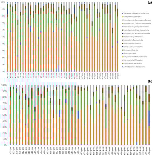 Patients received explanations and written instructions on how to collect stool samples. Stool nucleic acid collection tubes (Norgen, Biotec Corp., Thorold, ON, Canada) were used and fecal samples were stored at −80 °C until DNA extraction was performed using QIAamp DNA stool mini kits (QIAGEN, Hilden, Germany), according to the manufacturer’s instructions. DNA purity and concentration were measured using a NanoDrop™ 2000 Spectrophotometer (Thermo Fisher Scientific, Waltham, MA, USA) and a Qubit Fluorometer (Invitrogen Life Technologies, Carlsbad, CA, USA). Before amplification, DNA with a purity ratio of 1.8 to 2.0 was diluted to 5 ng/μL. Polymerase chain reactions were performed using forward (5′–TCGTCGGCAGCGTCAGATGTGTATAAGAGACAGCCTACGGGNGGCWGCAG–3′) and reverse (5′–GTCTCGTGGGCTCGGAGATGTGTATAAGAGACAGGACTACHVGGGTATCTAATCC–3′) primers specific for 16S rRNA. The amplicons were purified following standard procedures, then quantified, pooled, and sequenced using MiSeq Reagent Kits (Illumina, San Diego, CA, USA), according to the manufacturer’s instructions.