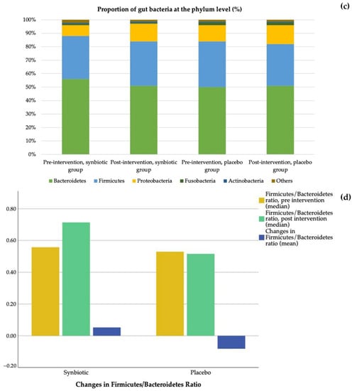 Changes in gut bacteria: (a) Class changes in the synbiotic group; (b) Class changes in the placebo group; (c) Comparison between the synbiotic and placebo group at the phylum level, before and after intervention; (d) Changes in Firmicutes/Bacteroidetes ratio.