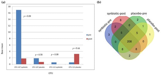 There were 251 OTUs identified in these samples (see Supplementary File Table S2). In the synbiotic group, there were two OTUs, OTU 107 (Bacteroides salyersiae) and OTU 122 (Dialister invisus), that showed a strong trend of changes in the base mean (Figure 6a). In the synbiotic group, OTU 107 and OTU 22 decreased from 16.95 to 1.78 (p = 0.08) and 0.55 to 0 (p = 0.08), respectively. In the placebo group, OTU 107 decreased from 1.84 to 0.70 (p = 0.58) while OTU 122 increased from 0.57 to 3.19 (p = 0.44). OTU 165 (Bifidobacterium bifidum), one of the bacteria in the synbiotic used in this study, increased in the synbiotic group from 1.04 to 1.21 (p = 0.93) and decreased from 0.86 to 0 (p = 0.38) in the placebo group. OTU 068 (Ruminococcus gnavus), which is in a study by Azzouz et al. [9] was found to be highly represented in SLE patients, decreased from 38.96 to 17.65 (p = 1) in the synbiotic group and increased from 3.97 to 19.56 (p = 0.51) in the placebo group.