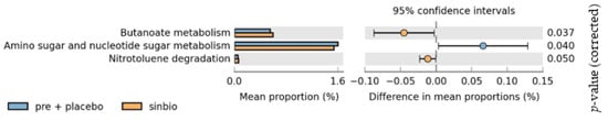 To further understand the functional changes in the gut microbiome, we also performed functional predictions using the Phylogenetic Investigation of Communities by Reconstruction of Unobserved States (PICRUSt) bioinformatics package (http://picrust.github.io/picrust/ (accessed on 13 June 2018). Functional prediction revealed significant increases in butanoate or butyrate metabolism (p = 0.037) in the post-intervention synbiotic group compared with the pre-intervention synbiotic group and the placebo group (Figure 7). Amino sugar and nucleotide sugar metabolism significantly decreased in the post-intervention synbiotic group compared with the pre-intervention synbiotic group and placebo group (p = 0.040).
