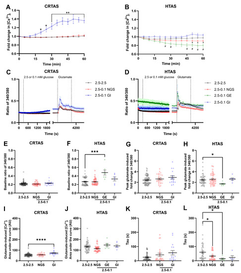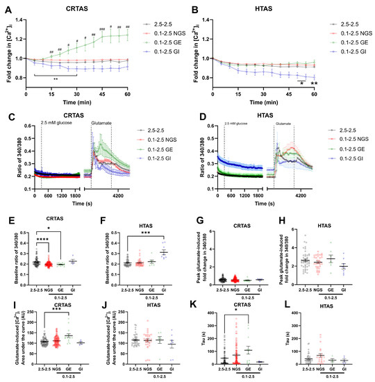 After one hour of normal or LG, glutamate was added for three minutes before wash-off. (Figure 2C,D). Glutamate-induced Ca2+ signal amplitude was less in HTAS GE-like cells compared to normal glucose-treated cells (Figure 2H). Interestingly, even though the [Ca2+]i of HTAS GE-cells had significantly decreased by the start of the glutamate treatment, it was still relatively higher than other groups, therefore the decreased signal amplitude may be explained by a relatively higher starting [Ca2+]i reaching the same peak glutamate-induced response. In CRTAS GI-like cells, the area under the curve (AUC) of glutamate-induced [Ca2+]i rises was significantly elevated compared to normal glucose-treated cells (Figure 2I), whereas no significant differences were found in the HTAS cells (Figure 2J). The elevated AUC of glutamate-response in the CRTAS GI-cells may be due to an increase in [Ca2+]i prior to the start of the glutamate-treatment period. The time constant (tau) for glutamate signal decay was significantly decreased in HTAS NGS and GE-like cells but remained unchanged in GI-like or CRTAS cells (Figure 2K,L).