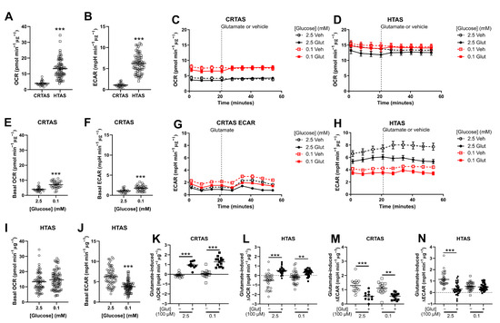 It was hypothesised that the LG-induced increase in population level [Ca2+]i in CRTAS (Figure 1A) would correspond with an increase in mitochondrial and/or glycolytic metabolism to fuel Ca2+ handling. Conversely, as LG decreased [Ca2+]i in HTAS, a corresponding decrease in cellular metabolism would be expected. Furthermore, as glutamate uptake has a substantial energetic cost [18], and there were differences in glutamate handling by glucose-sensing astrocytes, it was also thought that glutamate-induced cellular metabolic responses would be modulated by LG. To test this, CRTAS and HTAS were incubated in either 2.5 or 0.1 mmol/L glucose for 1 h, then oxygen consumption rates (OCR; indicative of mitochondrial metabolism) and extracellular acidification rates (ECAR; indicative of glycolytic function) were measured. Interestingly, basal OCR and ECAR were substantially and significantly higher in HTAS than CRTAS (Figure 4A,B). Both OCR (Figure 4E) and ECAR (Figure 4F) were increased in CRTAS exposed to 0.1 mmol/L glucose compared to 2.5 mM glucose. In contrast, however, HTAS OCR remained unchanged between normal and LG (Figure 4I), and ECAR was significantly lower in 0.1 mmol/L glucose-treated cells (Figure 4J). To test whether the effects of glutamate on metabolism were altered by LG exposure, glutamate was injected and OCR (Figure 4C,D) and ECAR (Figure 4G,H) were measured for a further 30 min. Compared to vehicle-treated cells, glutamate increased OCR in 2.5 and 0.1 mmol/L glucose and the response was comparable in both CRTAS (Figure 4K) and HTAS (Figure 4L). In both CRTAS (Figure 4M) and HTAS (Figure 4N), glutamate decreased ECAR compared to vehicle in 2.5 mmol/L glucose. In 0.1 mmol/L glucose, the ECAR significantly decreased in CRTAS, but not in HTAS, as these cells already displayed reduced ECAR.