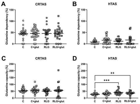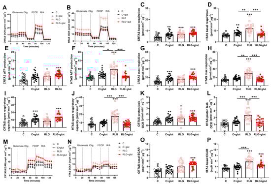 In HTAS the RLG group was also increased basal extracellular acidification rate (ECAR) compared to the control group (Figure 5N,P), with a trend (p = 0.073) towards increased ECAR in the CRTAS RLG group (Figure 5M,O). In both CRTAS and HTAS, the RLG + glut groups were significantly elevated from the control suggesting persistently higher rates of basal glycolysis/glucose utilisation following RLG + glut.