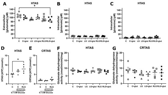 RLG and RLG plus glutamate altered mitochondrial fuel flexibility to increase the capacity to metabolise glutamine. Using pyruvate, fatty acid, and glutamine fuel pathway inhibitors, UK5099, etomoxir and BPTES (bis-2-(5-phenylacetamido-1,3,4-thiadiazol-2yl)ethyl sulfide), respectively, allowed for the measurement of the percentage of which CRTAS and HTAS were dependent on or had the capacity to metabolise glutamine. Dependency: contribution of that pathway to basal OCR. Capacity: maximal ability to consume oxygen through the pathway. CRTAS ((A); n = 25–28) and HTAS ((B); n = 24–25) dependency on glutamine fuel pathway. CRTAS ((C); n = 24–25) and HTAS ((D); n = 25–26) capacity to metabolism glutamine fuel pathway. Error bars represent standard error of the mean. ** p < 0.01; *** p < 0.001. Normally distributed data were analysed using one-way ANOVAs with post hoc Tukey’s multiple comparisons test. Abnormally distributed data were analysed using Kruskal–Wallis test with post hoc Dunn’s multiple comparisons test.3.9. Extracellular glutamate clearance is increased in HTAS following RLG and sustains ATP levels after prolonged low glucose exposure.