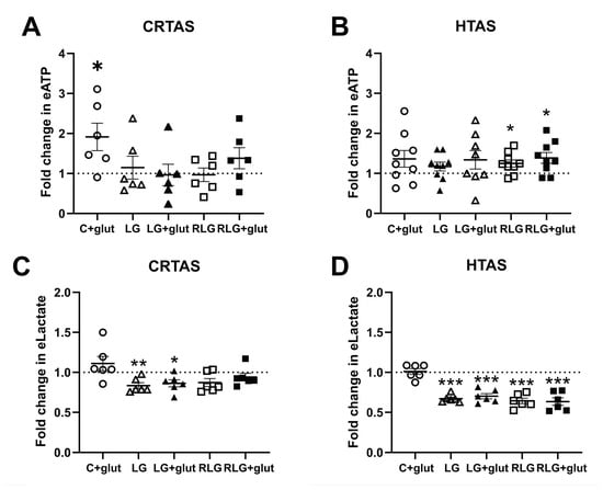 We next examined whether gliotransmitters were altered in CRTAS and HTAS following RLG. We examined extracellular ATP and lactate, both of which are gliotransmitters known to play a role in hypoglycaemia detection and defective CRR [6,8,33,34]. To test this, extracellular ATP (eATP) and lactate (eLactate) were measured in the conditioned media of CRTAS and HTAS cells exposed to control, C + glut, acute low glucose (LG), LG plus prior glutamate (LG + glut), RLG and RLG + glut treated cells. These cells were also exposed to glutamate for 30 min before the medium was collected. In CRTAS the concentration of eATP was significantly higher in C + glut treated cells than in the control, while the other groups were unchanged (Figure 8A). In the HTAS, however, both RLG and RLG + glut groups, when exposed to glutamate had elevated eATP concentrations compared to control (24.7% and 38.6% respectively; Figure 8B). Therefore, despite low energy availability after RLG and RLG + glut exposure, cells respond to glutamate stimulation by increasing ATP release. In acute low glucose conditions (LG and LG + glut) both CRTAS and HTAS (Figure 8C,D) had significantly decreased extracellular lactate. While CRTAS RLG and RLG + glut treated cells did not significantly decrease lactate levels compared to control, the HTAS RLG and RLG + glut treated cells did.