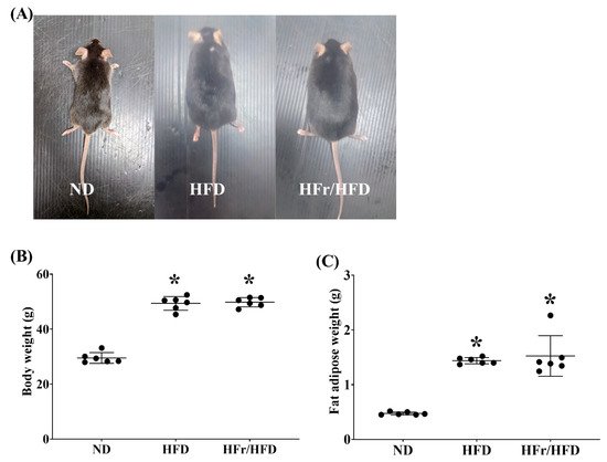 (A) Photographs of representative male C57BL/6J mice fed for 12 weeks with normal diet (ND), high-fat diet (HFD) and high-fructose/high-fat diet (HFr/HFD). (B) Comparison of mean body weight of the ND, HFD, and HFr/HFD groups. (C) Comparison of mean fat adipose weight of the ND, HFD, and HFr/HFD groups. Data were obtained from 6 mice in each group and presented as mean ± standard deviation. ND: normal diet group. HFD: the high-fat diet group. HFr/HFD: the high-fat diet plus 30% fructose in the drinking water group. * p < 0.05, versus the ND group.