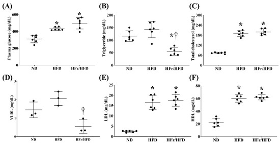 Plasma concentration of (A) glucose, (B) triglyceride, (C) total cholesterol, (D) very low-density lipoprotein (VLDL), (E) low-density lipoprotein (LDL), and (F) high-density lipoprotein (HDL). Glucose, triglyceride, total cholesterol, LDL, and HDL data were obtained from 6 mice in each group and VLDL data were obtained from 3 mice in each group. Data were presented as mean ± standard deviation. ND: normal diet group. HFD: high-fat diet group. HFr/HFD: high-fat diet plus 30% fructose in drinking water group. * p < 0.05, versus the ND group; † p < 0.05, the HFr/HFD group versus the HFD group.