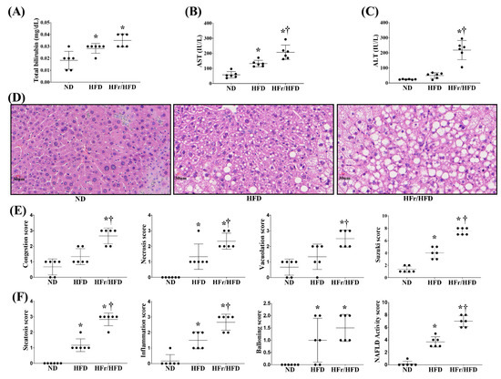 Plasma concentrations of (A) alanine aminotransferase (ALT), (B) alanine aspartate (AST), and (C) total bilirubin. (D) Representative microscopic findings of liver stained with hematoxylin–eosin (×200) and (E) parameters of Suzuki score (congestion, necrosis and vacuolation). (F) Parameters of NAFLD activity score (steatosis, inflammation, and ballooning degeneration). Data were obtained from 6 mice in each group and presented as mean ± standard deviation. ND: normal diet group. HFD: high-fat diet group. HFr/HFD: high-fat diet plus 30% fructose in drinking water group. NAFLD: non-alcoholic fatty liver disease. * p < 0.05, versus the ND group; † p < 0.05, the HFr/HFD group versus the HFD group.