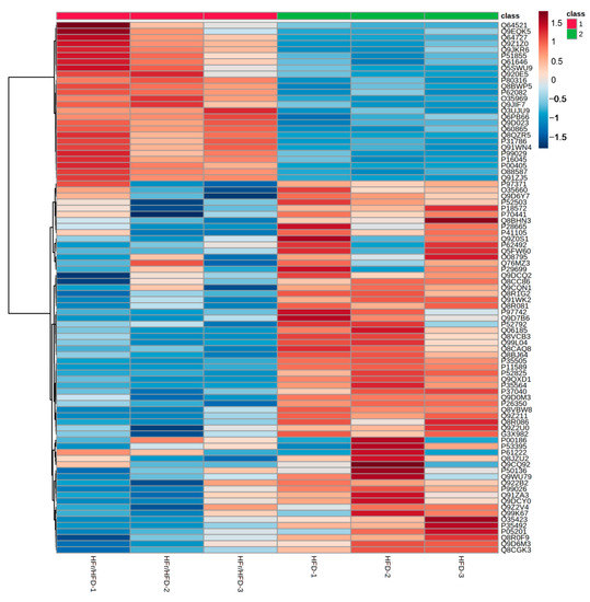 A label-free LC-MS/MS analysis was conducted to determine the total proteome alteration in mouse liver between the HFD and the HFr/HFD groups. Three biological replicates were performed for each of the HFD and HFr/HFD groups. Our analysis identified 1075 proteins with expression alterations between the HFD and the HFr/HFD groups. Figure 4 illustrates the heatmap.