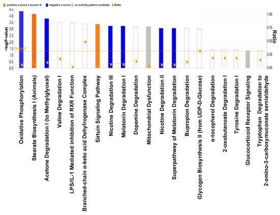 A comparison of the canonical pathways in the liver between the HFD and HFr/HFD groups using Ingenuity Pathway Analysis. An analysis of the pathway is depicted horizontally, and the unadjusted p-value is shown vertically (−log(p)). Expressions of canonical pathways are considered to be significantly different between these two groups at a p ≤ 0.05, with the threshold set to 1.3. Orange indicates pathway upregulation and blue indicates pathway downregulation in the HFr/HFD group, compared with the HFD group. A gray bar indicates that there can be no prediction. HFD: high-fat diet group. HFr/HFD: high-fat diet plus 30% fructose in drinking water group.