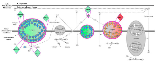 As stated above, the mitochondrial OXPHOS pathway was the most downregulated canonical pathway in the HFr/HFD group when compared with the HFD group. We further analyzed the dysregulated proteins involved in OXPHOS complexes using IPA (Figure 6). Our data demonstrated more downregulation of OXPHOS complexes I and III, and more upregulation of OXPHOS complex IV in the HFr/HFD group, when compared with the HFD group. Furthermore, the proteins of nicotinamide adenine dinucleotide (NAD) + hydrogen (H) (NADH): ubiquinone oxidoreductase subunits S3 (NDUFS3), S6 (NDUFS6), A5 (NDUFA5), and A12 (NDUFA12) in OXPHOS complex I, and cytochrome C (CYT C) in OXPHOS complex III were downregulated in the HFr/HFD group, when compared with the HFD group. In contrast, cytochrome C oxidase subunit 2 (Cox2) in OXPHOS complex IV was upregulated in the in the HFr/HFD group when compared with the HFD group. We noted that expression of OXHPOS complexes II and V were not significantly different between the HFD and HFr/HFD groups.
