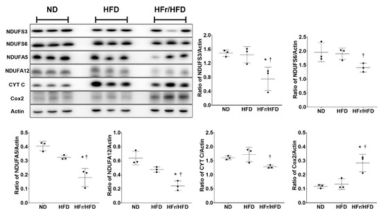 Representative gel photography of immunoblotting assay in liver tissues for the levels of NDUFS3, NDUFS6, NDUFA5, NDUFA12, CYT C, Cox2, and Actin (the internal standard) in the ND, HFD and HFr/HFD groups. Quantification of band intensity represented as ratio to targeting protein over Actin. Data were derived from three mice in each group and presented as mean ± standard deviation. NDUFS3: NADH: ubiquinone oxidoreductase subunits S3, NDUFS6: NADH: ubiquinone oxidoreductase subunits S6, NDUFA5: NADH: ubiquinone oxidoreductase subunits A5, and NDUFA12: NADH: ubiquinone oxidoreductase subunits A12. CYT C: cytochrome C. Cox2: cytochrome C oxidase subunit 2. ND: normal diet group. HFD: high-fat diet group. HFr/HFD: high-fat diet plus 30% fructose in drinking water group. * p < 0.05, versus the ND group; † p < 0.05, the HFr/HFD group versus the HFD group. Note. The original images of immunoblotting assay can be found in the Supplemental Materials: Figure S1.