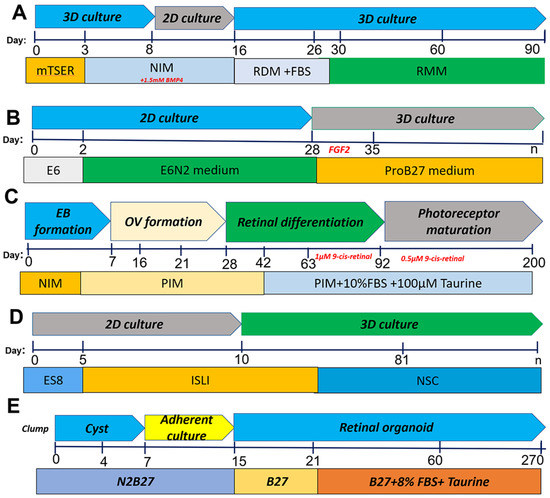 - Mellough, C.B.; Collin, J.; Queen, R.; Hilgen, G.; Dorgau, B.; Zerti, D.; Felemban, M.; White, K.; Sernagor, E.; Lako, M. Systematic Comparison of Retinal Organoid Differentiation from Human Pluripotent Stem Cells Reveals Stage Specific, Cell Line, and Methodological Differences. STEM CELLS Transl. Med. 2019, 8, 694–706. [Google Scholar] [CrossRef]