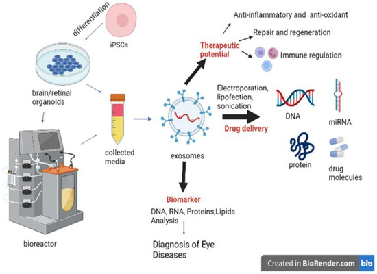 | hiPSC-derived 3D retinal organoids | Differential centrifugation | The functional 3D RO-derived EVs contains contained small noncoding RNAs cargo including miRNA, tRNA, and piRNA which are released continuously and are related to post-translational modification and human retinal development regulation. The internalization of 3D RO EVs by hRPCs is necessary for the regulation of genes involved in retinal homeostasis and developmental processes, such as nuclear transport, transcription, GTPase regulation, and ganglion and photoreceptor cell differentiation. | [196] |