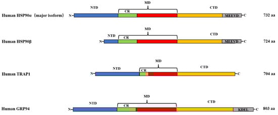Diversity of protein domains of human HSP90 family members. HSP90α and HSP90β are mainly in the cytoplasm, TRAP1 is mainly in the mitochondrial matrix, and GRP94 is mainly in the ER; HSP90α, HSP90β, GRP94, and TRAP1 are, respectively, 732, 724, 803, and 704 amino acids in length. Their overall molecular structure includes three major conserved domains: NTD (ATPase, co-chaperone binding), MD (client protein binding, co-chaperone binding, ATPase activation), and CTD (dimerization, co-chaperone binding, client protein binding). CR in the above figure represents charged flexible linker.