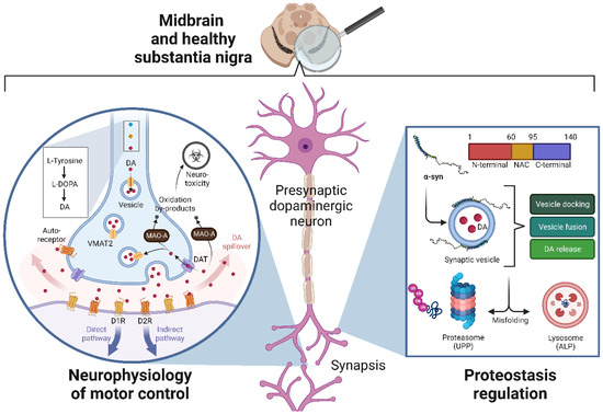 Neurophysiology of motor control (left) and proteostasis regulation (right) in healthy midbrain substantia nigra pars compacta dopaminergic neurons. In regular motor control, DA (synthesized from L-tyrosine) is encapsulated in synaptic vesicles by VMAT2. and then released to excite DA receptors D1R and D2R, thereby triggering the direct and indirect pathways of motor regulation, respectively. DA can spillover if not reuptaken by the neuron through the DAT. Free DA in the cytosol and the extracellular matrix can be oxidized by MAO-A into neurotoxic by-products. On the other hand, α-syn regulates the docking, fusion, and release of DA from synaptic vesicles are regulated. When the protein is misfolded, dopaminergic neurons eliminate it through the UPP or the ALP pathways. DA: dopamine; L-DOPA: levodopa; VMAT2: vesicular monoamine transporter 2; MAO-A: monoamine oxidase A; D1R: dopamine 1 receptor; D2R: dopamine 2 receptor; DAT: dopamine transporter; α-syn: alpha-synuclein; NAC: non-amyloidogenic component; Ub: ubiquitin; UPP: ubiquitin-proteasome pathway; ALP: autophagy-lysosomal pathway. Figure made in BioRender.com.