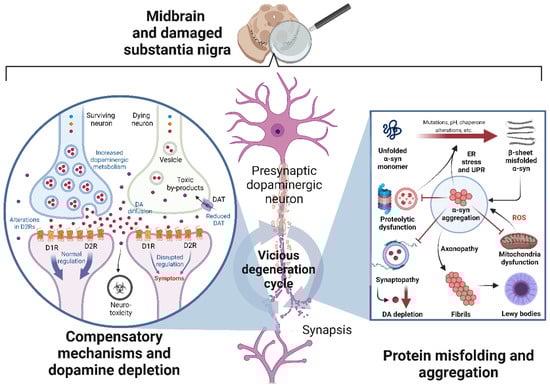 Pathophysiological mechanisms of neurodegeneration: dopamine depletion (left) and loss of proteostasis (right) in damaged midbrain substantia nigra pars compacta dopaminergic neurons. Upon dopaminergic neurodegeneration, surviving neurons activate compensatory mechanisms to maintain striatal DA concentrations and keep normal motor regulation. Such mechanisms include increased dopaminergic metabolism, alterations in D2Rs, reduced DAT expression, and an increment in DA diffusion. Nonetheless, if neurodegeneration continues, DA depletion translates into a disrupted regulation of motor control and, hence, symptoms. Such neurodegeneration is caused, among other factors, due to the loss of proteostasis. When misfolded into a β-sheet composition due to mutations, pH, or chaperon alterations, α-syn can aggregate. This aggregation disrupts the UPP and ALP proteolytic pathways (inhibiting misfolded α-syn degradation); stresses the ER activating the UPR; causes mitochondrial dysfunction, which generates toxic ROS species that further facilitate α-syn aggregation; alters normal synaptic processes (synaptopathy), which in turn causes a DA depletion; and creates fibrils that travel through axons (axonopathy) into the cytoplasm, where fibrils sequester organelles and proteins to form LBs. Consequently, α-syn misfolding and aggregation generate neurotoxicity in dopaminergic neurons, causing the vicious degeneration cycle observed in PD. DA: dopamine; D1R: dopamine 1 receptor; D2R: dopamine 2 receptor; DAT: dopamine transporter; α-syn: alpha-synuclein; ER: endoplasmic reticulum; UPR: unfolded protein response; UPP: ubiquitin-proteasome pathway; ALP: autophagy-lysosomal pathway; ROS: reactive oxygen species; PD: Parkinson’s disease. Figure made in BioRender.com.