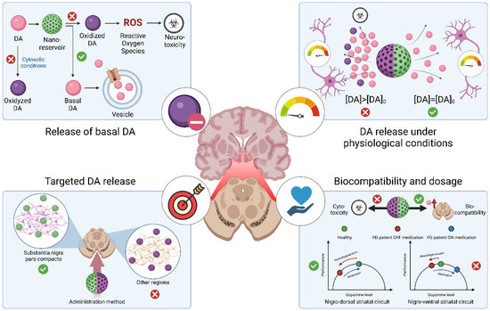 Conditions required for the development of novel nanostructure dopamine delivery systems. Firstly, the nanoreservoir must stabilize DA in its basal state, avoiding its oxidation until its release and encapsulation in synaptic vesicles since oxidized DA derivatives increase the production of ROS, which generates neurotoxicity. In addition, the release rates of stabilized DA must meet the physiological needs of dopaminergic neurons without exceeding physiological extracellular [DA]0 concentrations. It must also be ensured that such release takes place only in the necessary regions, regardless of the method of administration, so that DA is not wasted or oxidized, causing neurotoxicity. Finally, the nanoreservoir must comply with the principle of biocompatibility and adequate dosage since an overdose of DA could lead to dysregulation of motor performance. DA: dopamine; ROS: reactive oxygen species. Figure made in BioRender.com.