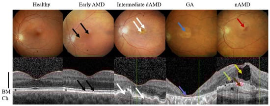Fundus photographs (upper panel) and optical coherent tomographs (lower panel) from healthy individual, early AMD with pigment mottling (black arrows), intermediate dAMD with drusen (white arrows), GA (blue arrows) and nAMD with choidal neovascularization and hemorrhage (red arrows) that coincide with intra- (yellow arrow) and subretinal (green arrow) fluids. Black column indicates neural retina and asterisk the RPE layer that both are atrophic or missing in GA. Abbreviations: AMD, age-related macular degeneration; BM, Bruch’s membrane; Ch, choriocapillaris; d, dry; GA, geographic atrophy; n, neovascular and RPE, retinal pigment epithelium. Note that BM (red line) is not optically recognized right when pathology increases and thus it starts to wave.