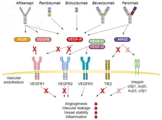 Mechanism of action of anti-VEGF treatments currently used to treat neovascular age related macular edema. Activation of VEGFR2 by VEGF-A plays a major role during angiogenesis, the role of VEGFR1 and VEGFR3 during neovascularization is less pronounced. Binding of ANG2 to TIE2 and Integrin α5β1, αvβ5, α3β1 and αvβ3 will further. All the antiangiogenic agents used to treat age related macular degeneration, binding to VEGF-A and prevent its signaling. Aflibercept, which is a fusion protein, will also bind to PLGF and VEGF-B. Faricimab instead is a bi-specific antibody and will bind to both ANG2 and VEGF-A. Whether faricimab will inhibit binding of ANG2 to integrins is less well characterized than its capability to intervene with ANG2-TIE2 signaling. Both ranibizumab and brolucizumab antibody fragments that inhibit VEGF-A signaling. Brolucizumab is a humanized monoclonal single-chain Fv (scFv) antibody fragment and ranibizumab is a humanized monoclonal antibody fragment. VEGF-C and VEGF-D are ligands for both VEGFR-3 and VEGFR-2 and may mediate pro-angiogenic signals even in the presence of previously mentioned anti-VEGF treatments. Abbreviations: PLGF, placental growth factor; VEGF, vascular endothelial growth factor; ANG, angiopoietin; VEGFR, vascular endothelial growth factor receptor, TIE, tyrosine kinase with Ig and EGF homology domains.